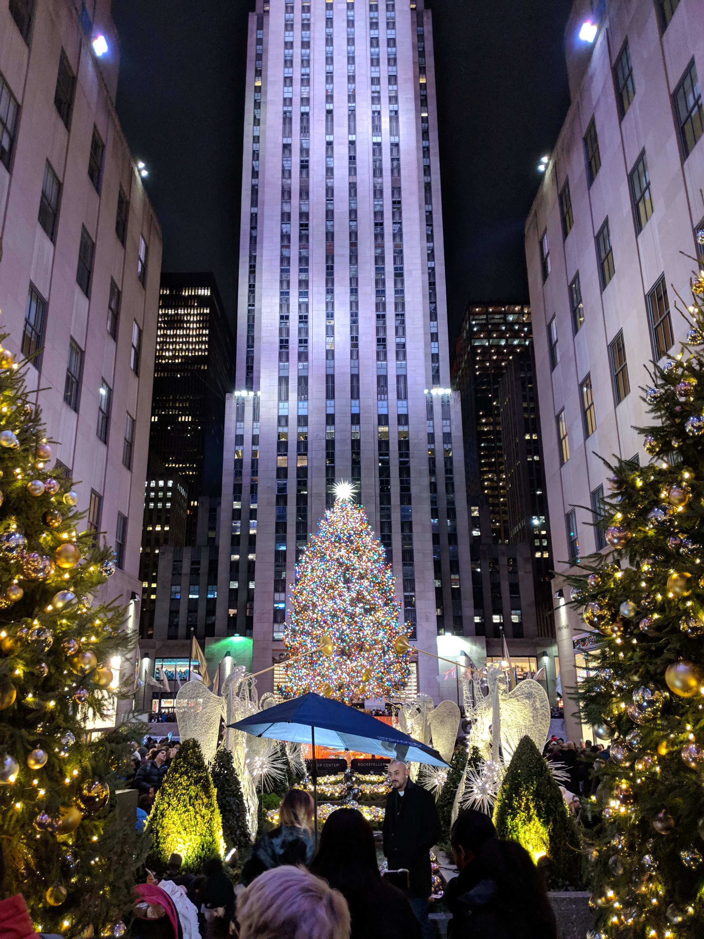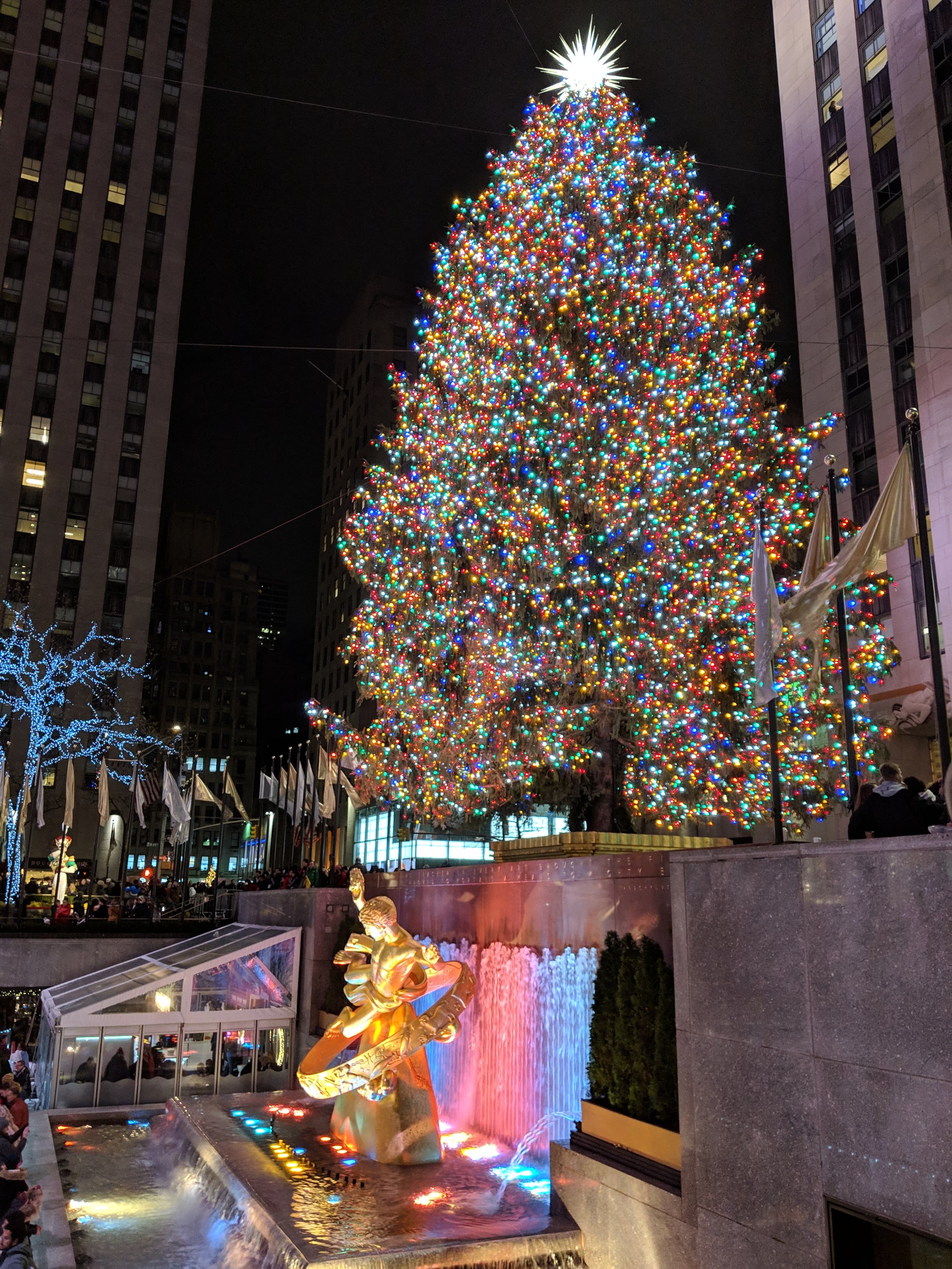 Of course, the famous Rockefeller Christmas Tree is a spectacular sight. We go in every year for this reason alone. The gorgeous tree chopped and shipped from it’s forest to the swarming streets of NYC. Then, every inch decorated by lights and tinsel. The gold and silver flags add to the beauty of the I’ve skating rink and gorgeous gold statue, resting below the tree.