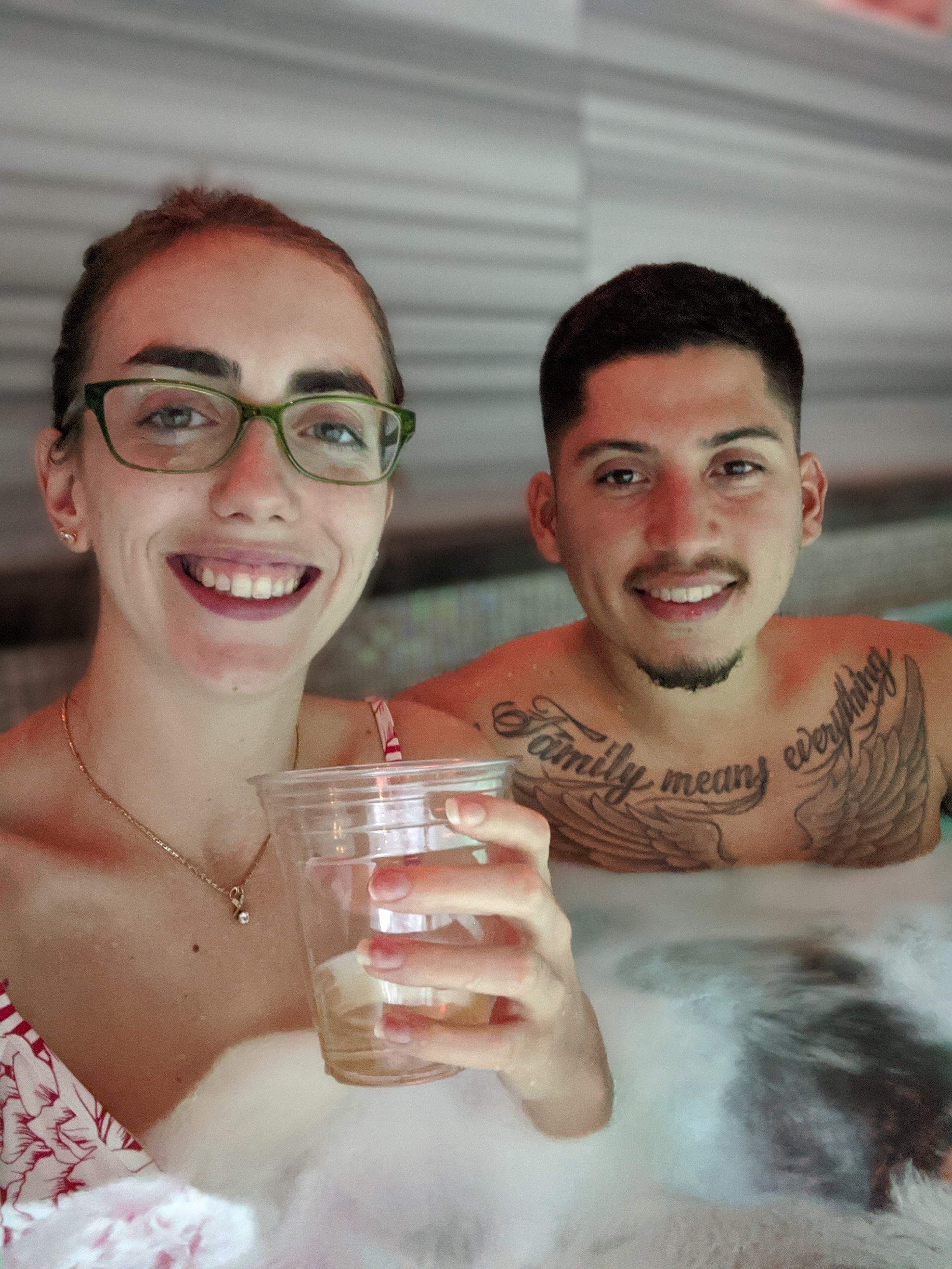The next morning, we tried the Hard Rock Cafe. It was finally Friday and I got my Eggs Benedict. We were very happy with our orders, Piero got the avocado toast with chipotle sauce and hash browns. Happy with our meal and server, we started the rest of our day. We went over to another hotel, Ocean Casino Resort. Next time, this is where we will stay here… If we do end up going again. This hotel is beautiful, the ocean theme just gorgeous. We came here for the spa. Yes, another spa – you shouldn’t be surprised anymore! We like to try new things, but our activities always include a spa day. Their pool area was cozy, with a couple pools and a lounge area. The bar is in an alcove right next to the lounge area. We ordered drinks and food at the bar which is not served at the bar. I am not sure if that was because we were two out of about six or eight people, or that is how it is run all year round. The food and drinks came from the kitchen, which took about a half hour maybe a bit more. Except since we are next to a pool, they do not allow glass and we ended up with cans and cups to pour our own drinks. Along with a plate of hummus with bags of chips, so we weren’t sure why it took so long to get there.